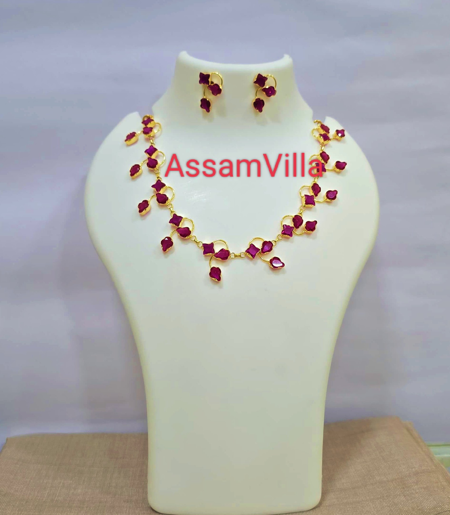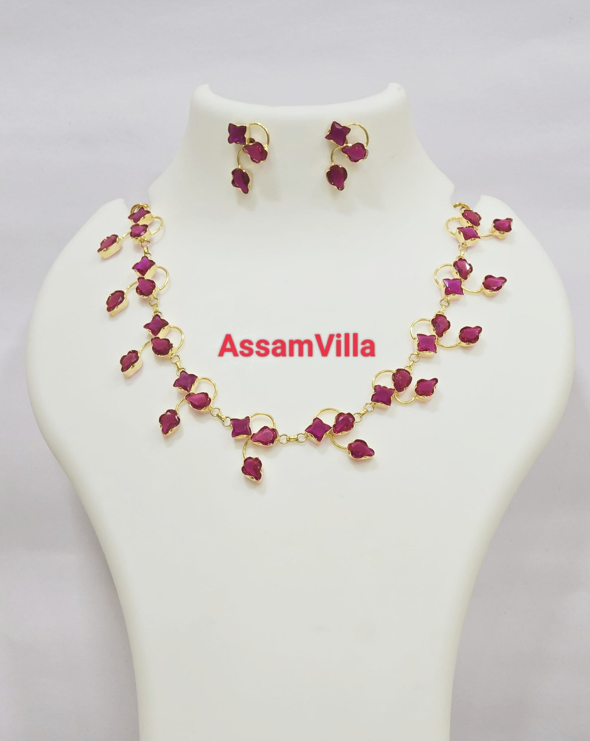 Assamese traditional pure silver based gold polished pink stone golpota set