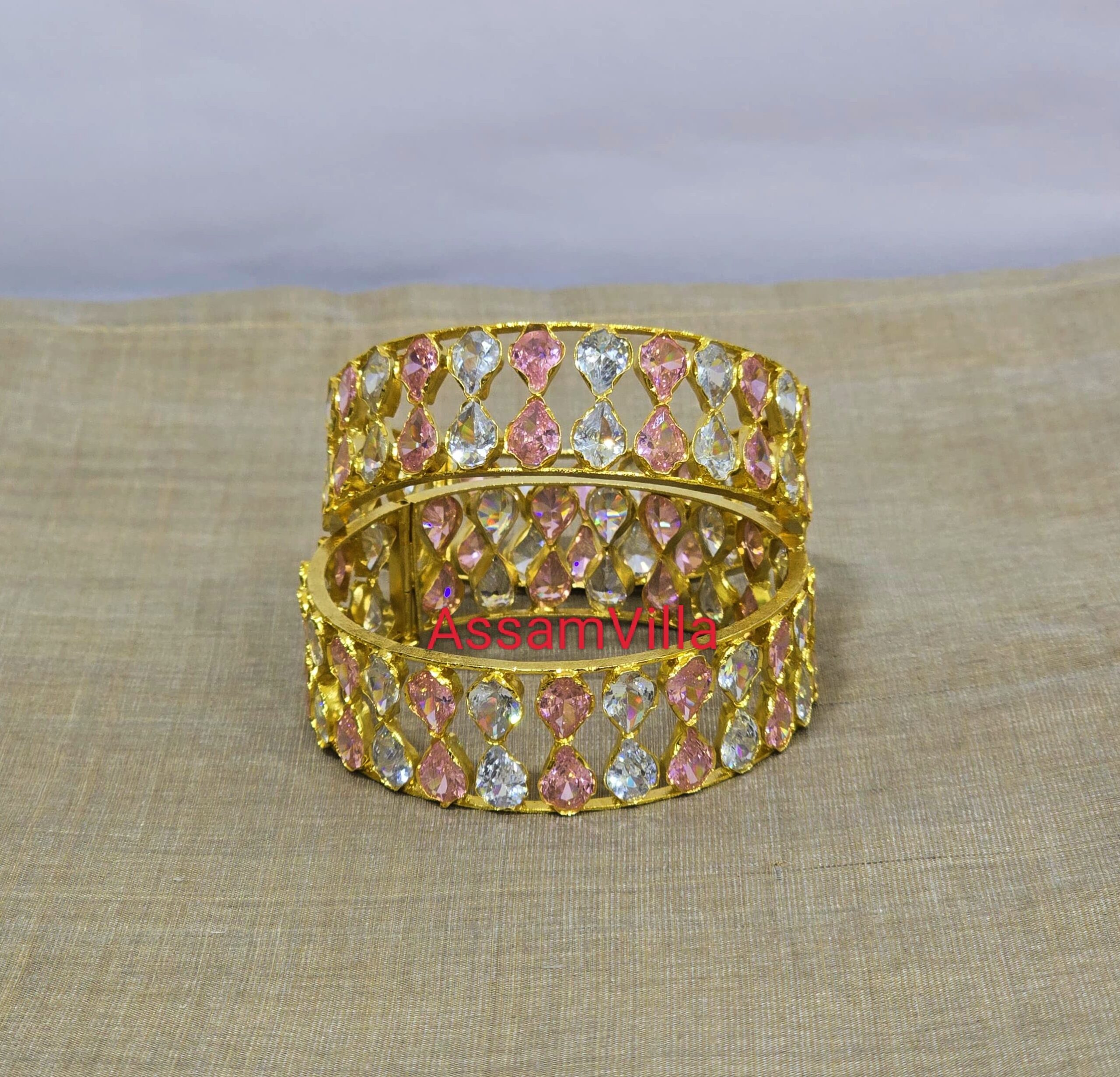 Assamese traditional pure silver based gold polished white and pink stone floral bangles